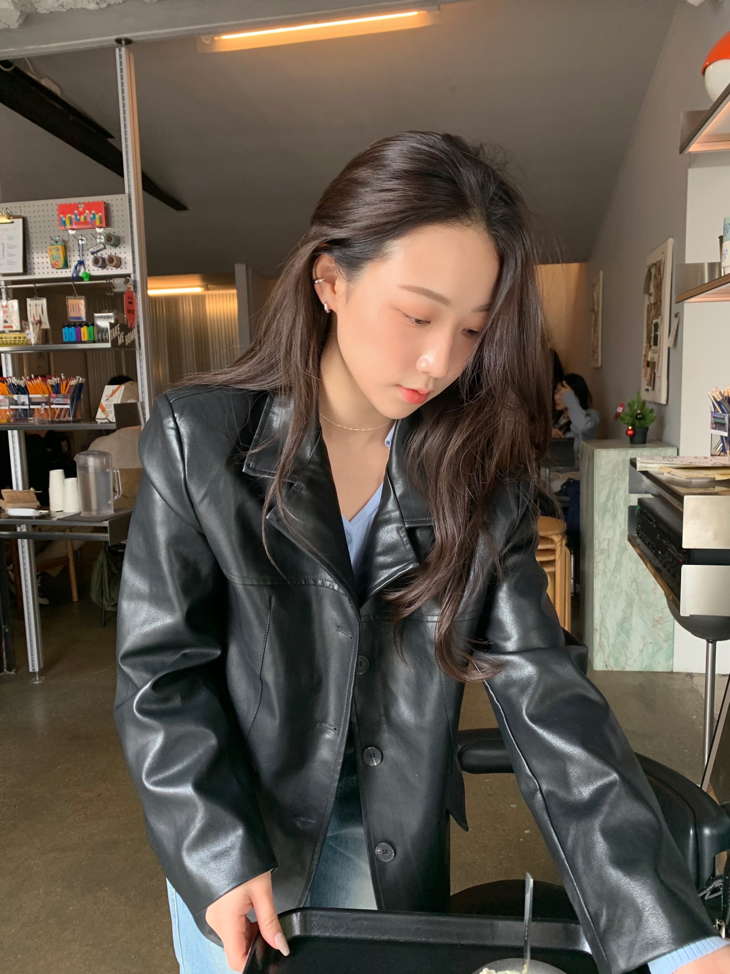 casual leather jacket / black